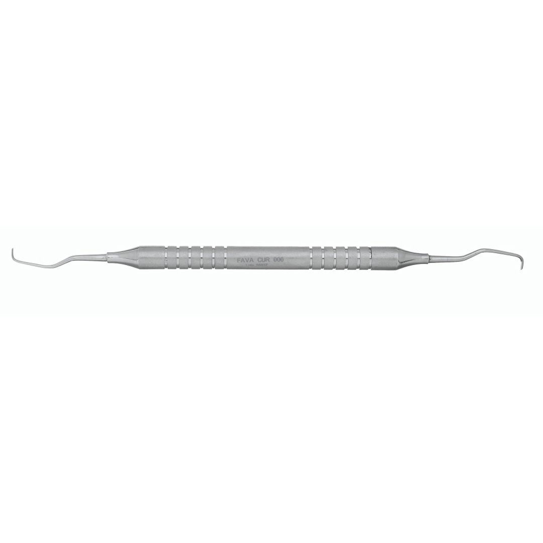 A Cureta Gracey 11/12 FAVA é projetada especificamente para as faces mesiais de dentes posteriores (pré-molares e molares). Sua angulação complexa facilita o acesso a bolsas profundas.