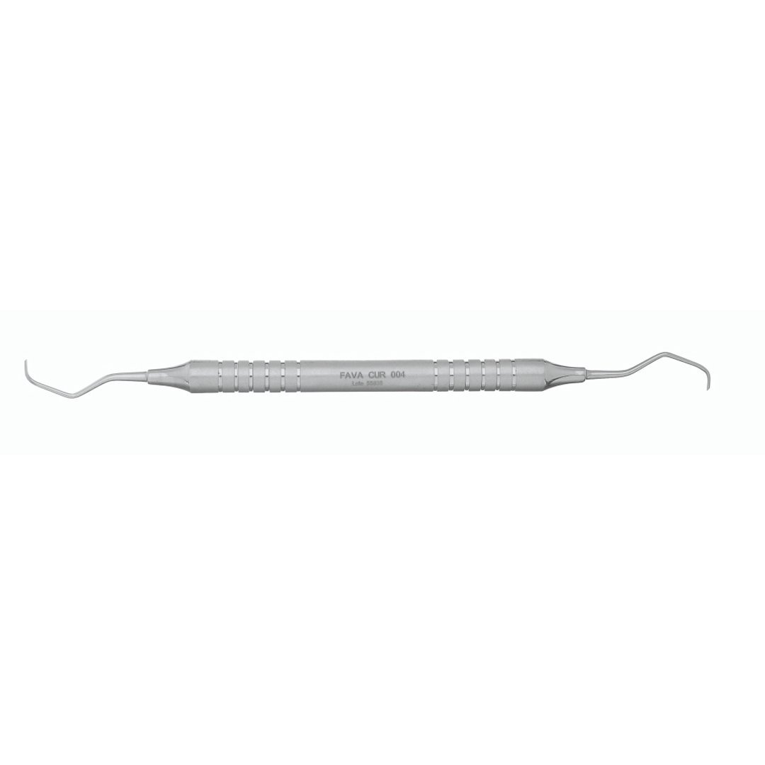 A Cureta Gracey 3/4 FAVA é indicada para dentes anteriores, oferecendo uma contra-angulação ligeiramente maior que a 1/2, facilitando o acesso aos caninos e pré-molares.