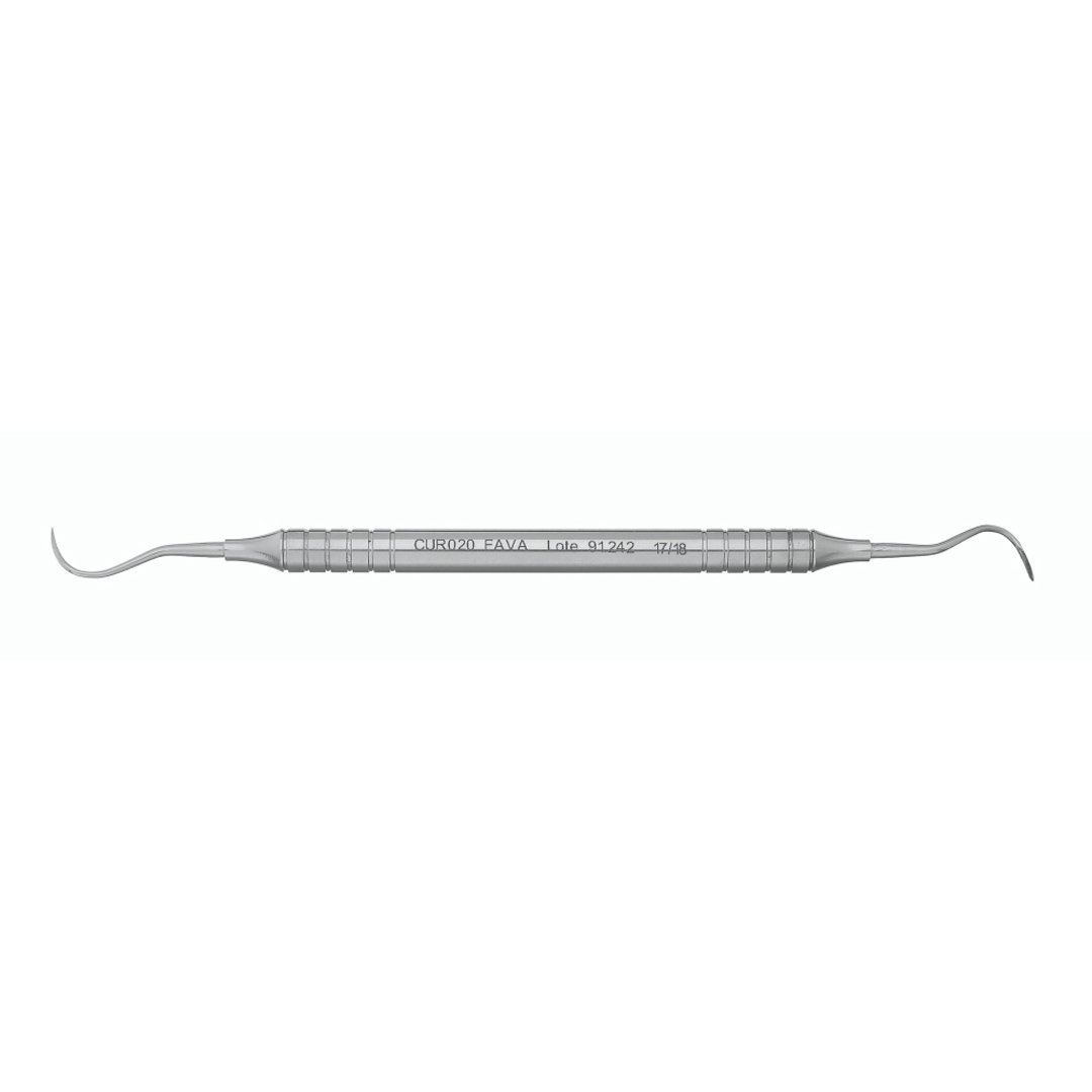 A Cureta MC Call 17/18 é projetada para a raspagem de molares, com hastes anguladas que permitem contornar a coroa e atingir bolsas periodontais profundas em dentes posteriores.