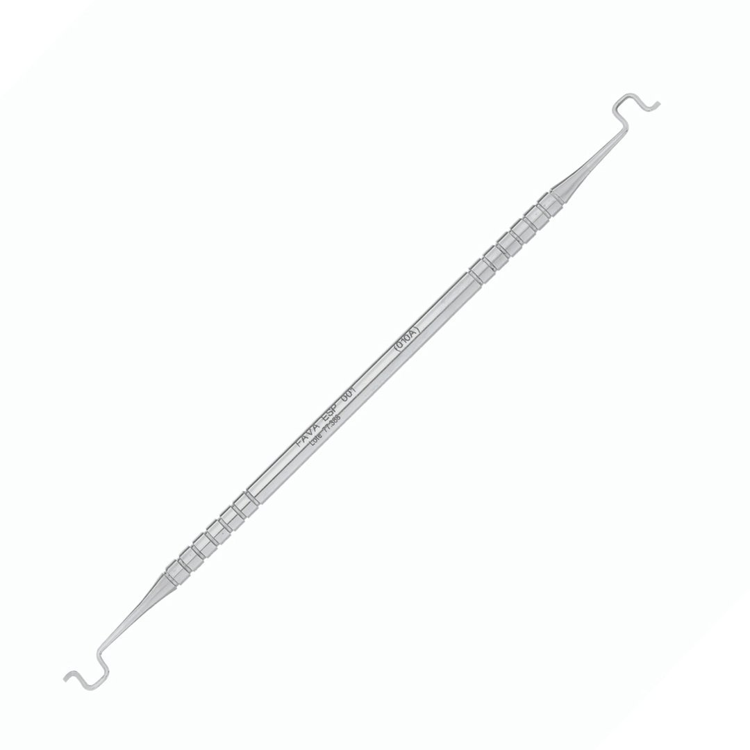 A Espatula Colocador Elastique Duplo (010A) FAVA é um instrumento de ponta dupla projetado para facilitar a colocação de ligaduras elásticas (borrachinhas) nas asas dos bráquetes.