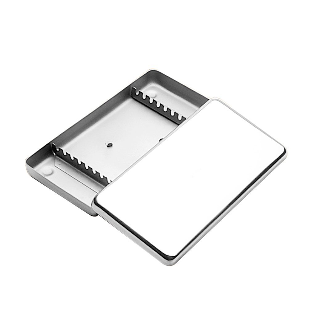 Projetado para instrumentos de médio porte, este estojo em aço inox com acabamento polido oferece segurança e praticidade para clínicas odontológicas e médicas.