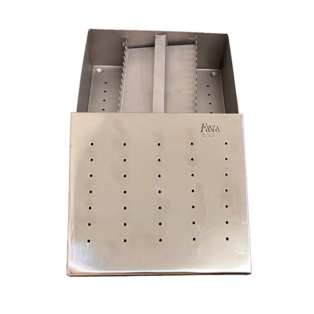 O Estojo Inox 101PFI da Fava oferece durabilidade e acabamento polido, com estrutura perfurada que permite ventilação ideal para esterilização em estufas e autoclaves.