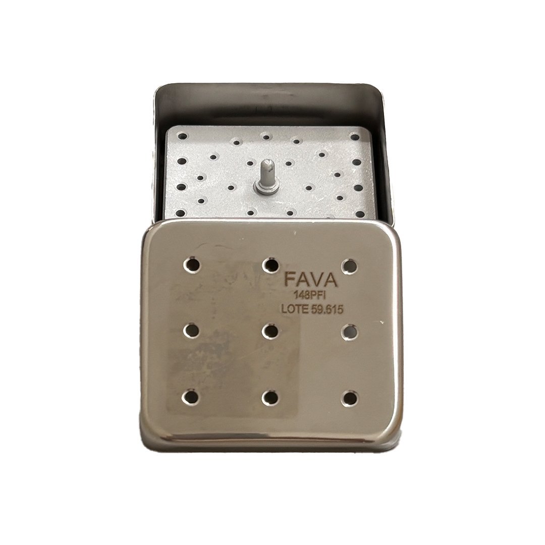 Produzido em aço inox, o Estojo com Escotilha da Fava oferece estrutura lisa e robusta, garantindo alta durabilidade e proteção superior durante a esterilização.