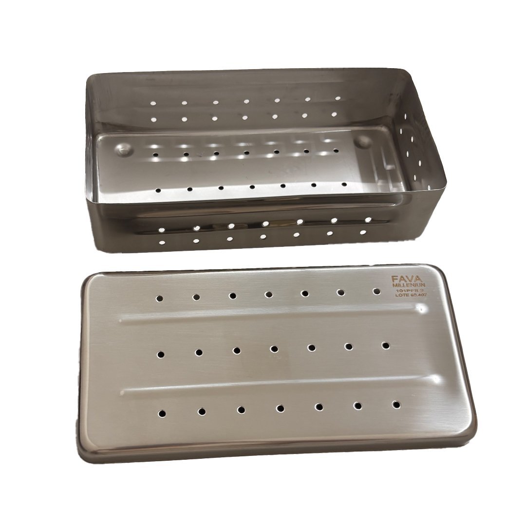 O Estojo Inox 101PFI da Fava oferece durabilidade e acabamento polido, com estrutura perfurada que permite ventilação ideal para esterilização em estufas e autoclaves.