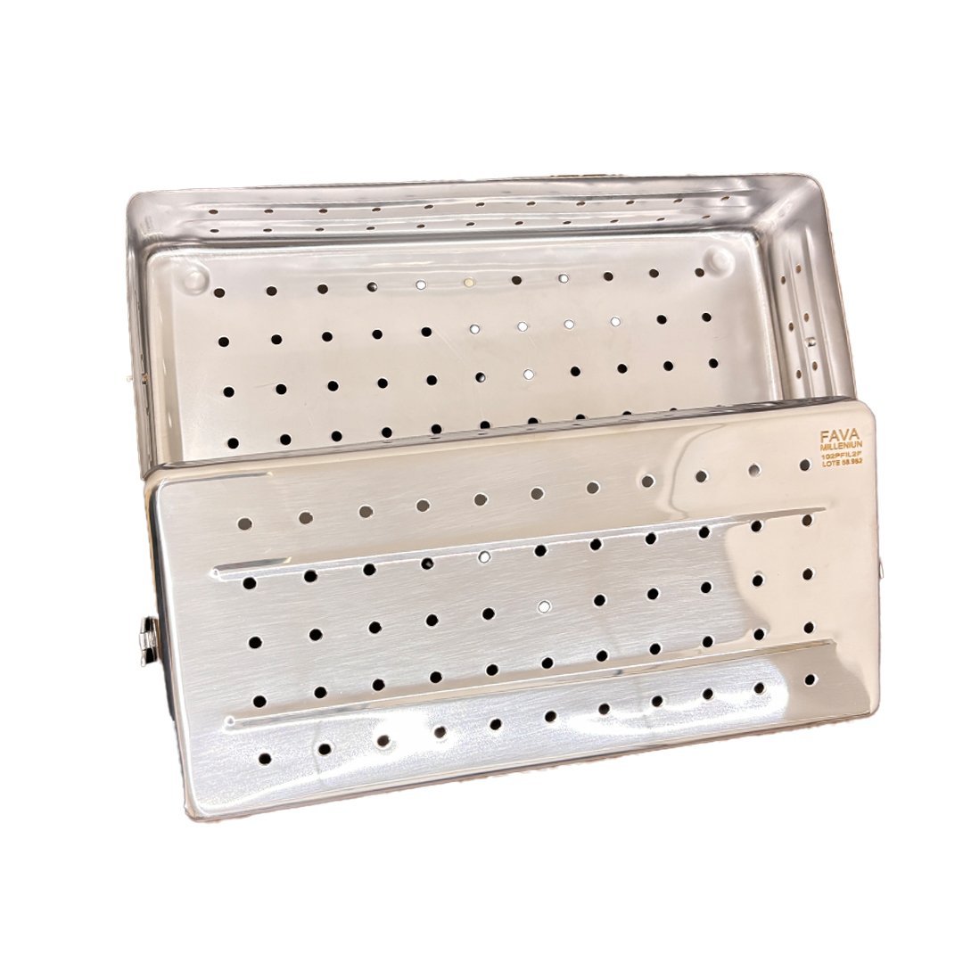 O Estojo Inox da Fava possui estrutura perfurada que permite excelente ventilação, garantindo uma esterilização eficiente em autoclaves e mantendo os instrumentos organizados.