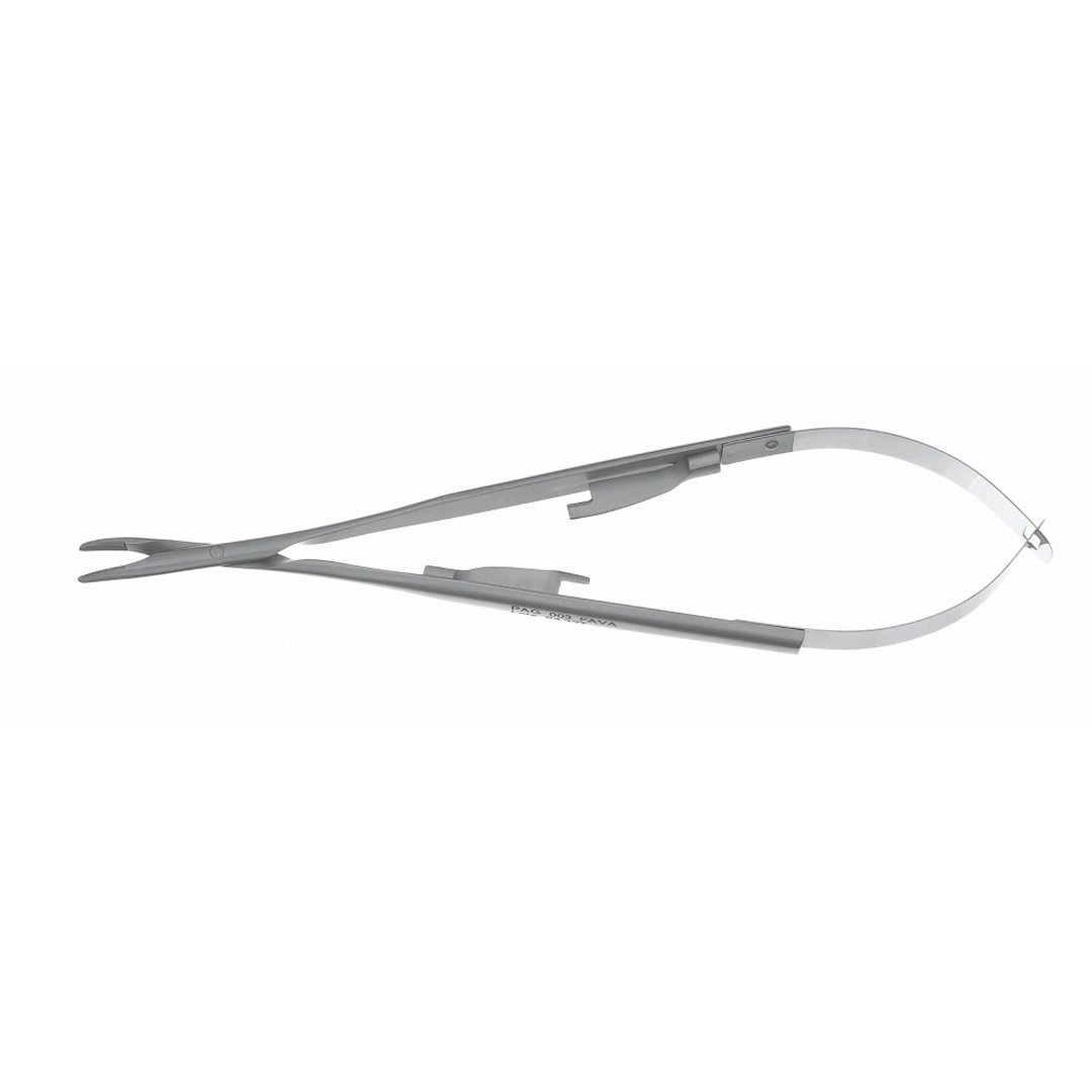 O Porta Agulha Castroviejo c/Widia Curvo 15CM CHAPA é projetado para segurar e conduzir a agulha de sutura com firmeza. Seu sistema de travamento garante segurança e precisão durante a síntese dos tecidos.